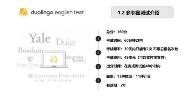 多邻国英语测试(Duolingo English Test, DET)是一个在家既可完成的英语测试考试平台,为有留学计划的学生提供语言水平证明。在完成测试的48小时内考生就可以获得成绩。多邻国英语测试凭借其方便和价格上的优势,在雅思、托福语言考试非常难以安排的疫情期间横空出世,颇有一点动摇雅思托福霸主地位的意思。而duolingo考试不仅考试便捷出分快,在duolingo考试作弊方面也有更大空间。